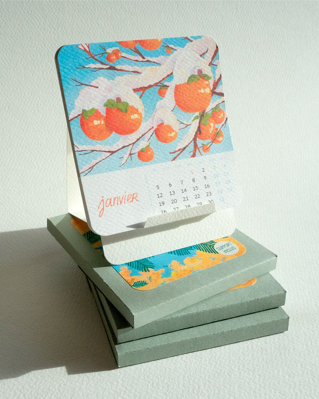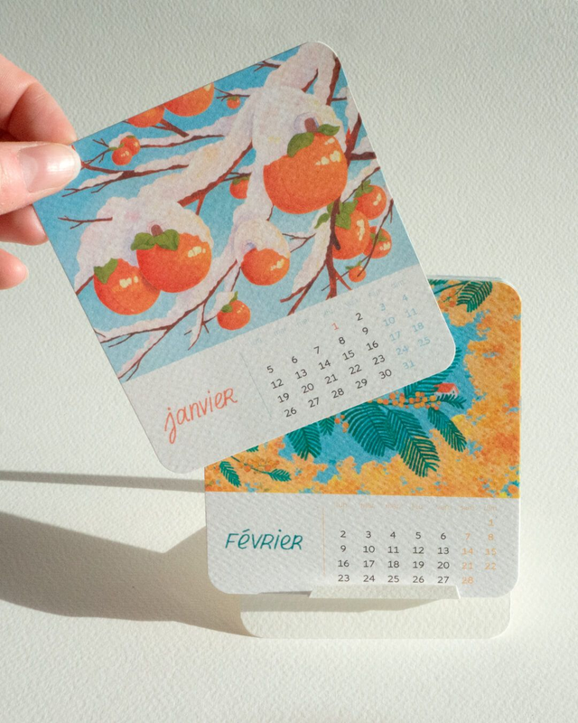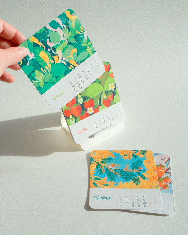 - 12 cartes format 10x10,5cm (1 carte par mois) et support à plier, le tout dans une petite boîte faite main